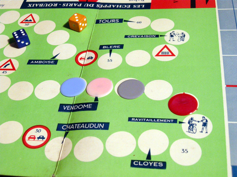 The game consists of two parts. The first part is played on the green part of the board, and it is a dice game. The sprint of the race is played on the "velodrome" (blue) part of the board and uses the aleatory record.