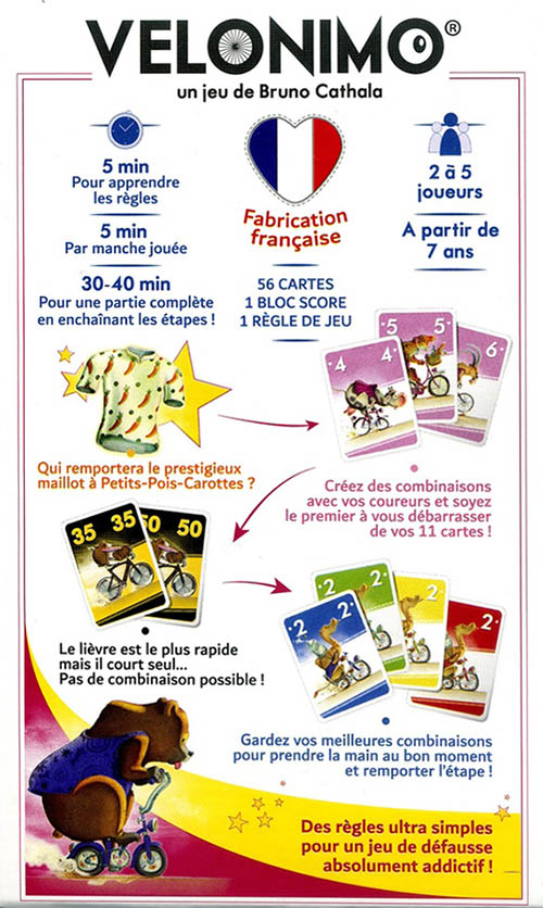 The game can be played by 2 to 5 players, though the rules for 2 players are a little different (as is quite usual in modern games). It is played with a deck of 56 cards: seven cards (numbered 1 to 7) in seven different colours, six special ("hare") cards with values between 35 and 50, and a special KOM maillot card.