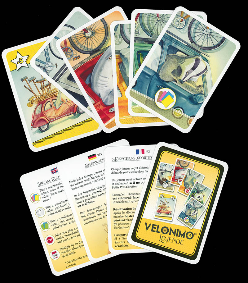 There are only 32 cards in this deck. If you compare it to the original game, there are two colours less, two cards less in each colour, and just three special cards, though we have four maillot cards not present in the original game. This game can be played by two to four players (while the original can be played by up to five) and, of course, the playing time is shorter. Furthermore, the cards are just slightly smaller than the original ones. While this does not make any difference in the feel of the cards in your hand, it makes it impossible to use the Legends expansion with this deck.