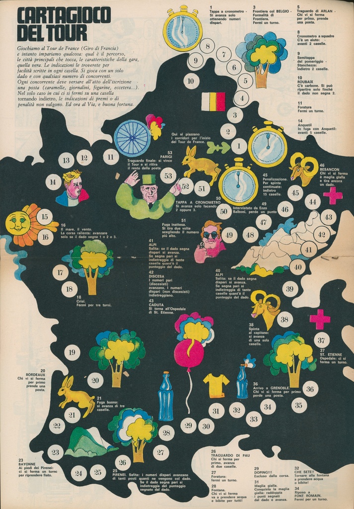 If you fall on square 50, you go back one square to be interviewed by a certain Enzo Balboni. I have tried to find more about him, but I have not discovered much, except that he had written some cycling articles for Il Vittorioso before and that he wrote a cycling novel some years later. Maybe he was not that famous after all, and his presence in the game is just an internal joke. I wonder if my Italian friends can help me with that.