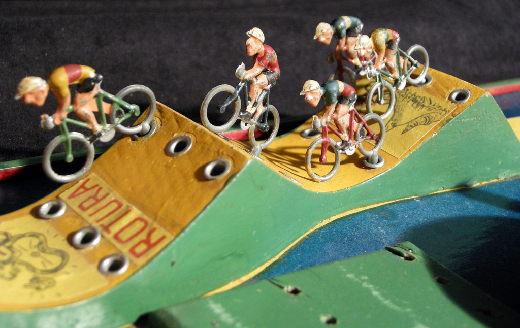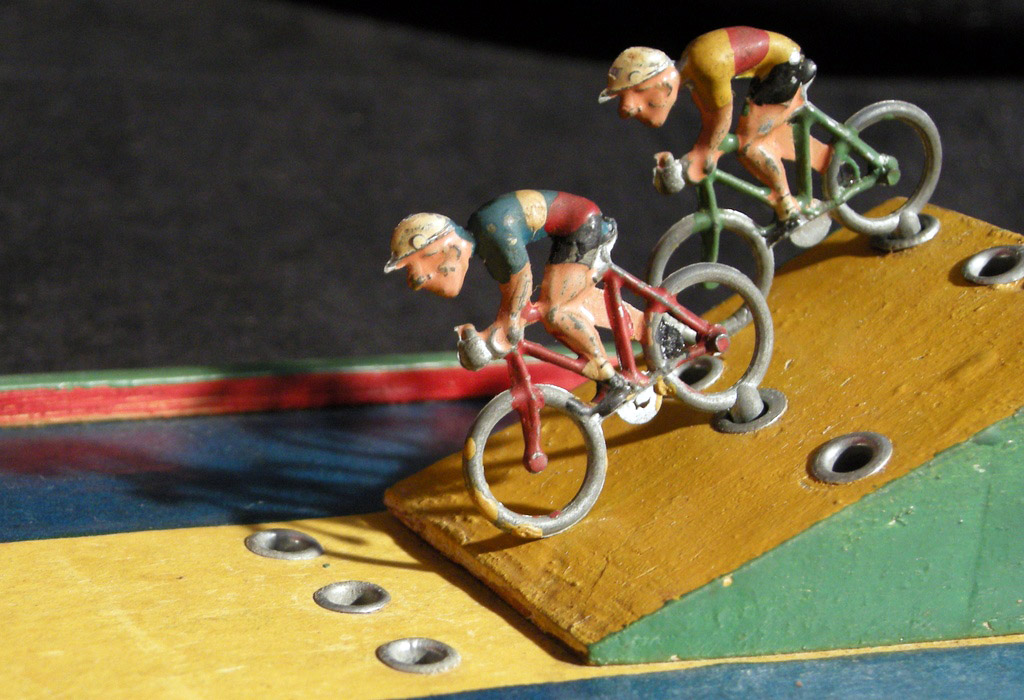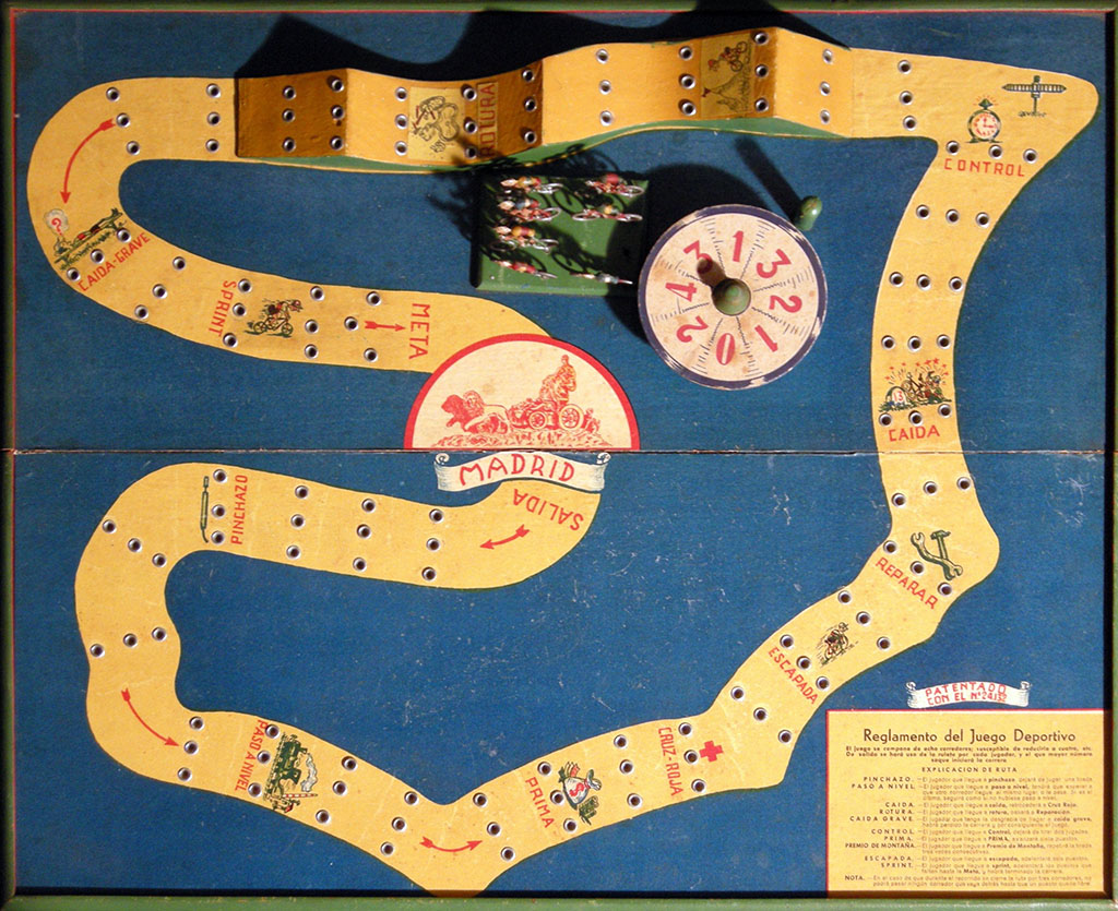 The open board measures 61 x 50 cms It is a two-folded wooden panel with rivets where metal riders are inserted. Riders are moved according to the result of a spinner, and the game is a roll-and-move game (in this case, spin-and-move). The really outstanding feature are the three-dimensional mountains. (33 / 35 mm high),