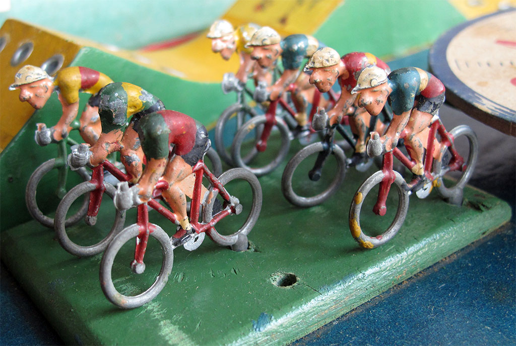 The cyclists are painted in different colours (the riders in the third box I saw had lost almost all the paint, so I cannot say). As you can see the cyclists in the first picture (green box) are painted more delicately. My guess (and it is only a guess) is that they were made first, that is, that the green box is the first edition. Of course that may be a biased deduction based on that it was the first I got.