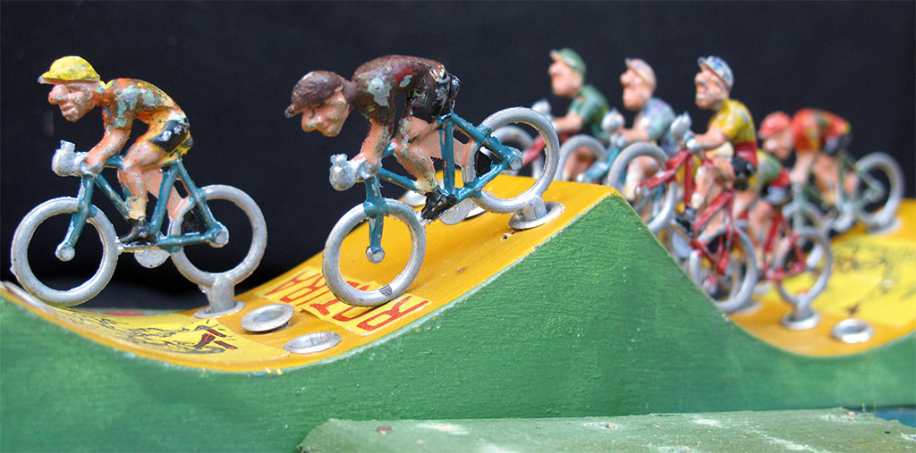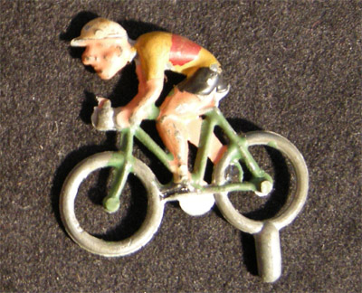 British artist Martyn Overs has decided to try and make his own version of the game after seeing it in my website (which makes me really happy). He has sent this picture of the riders he has made. He has glued a spigot to a plastic figure (somewhat bigger than the original), then made a heat proof rubber mould and poured lead free pewter into it. The result is quite good considering it is all done by hand without a centrifuge nor any compressed air injection facilities. I cannot wait to see the result when he eventually makes the board!