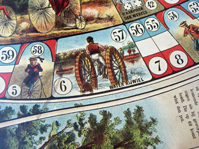 UPDATE 2024: Sigfried L. points out that in this game there are two tracks that run in opposite directions, the red track going counterclockwise from the outside in, as is usual in games of goose, and the blue track starting from the centre and running clockwise. As this game is almost a classic game of goose, we find the two usual "dice squares" though, instead of being on squares 26 and 53, they are on 21 and 42 to keep chances on both tracks equal. Nevertheless, Siegfried also remarks that the blue track is favoured since the "gebroken rijwiel" (broken wheel) and the "gevallen" (fall) squares, which have the same effects on the game, are unevenly positioned on the different tracks. On the red track, a player on square 62 throwing a sum of 6 or 12 will inevitably land on the "broken wheel". The chance of this happening is 16,6 % (6/36). On the blue track, however, a player on square 62 can land on the "fall" (square 44) only when throwing a sum of 10 (8,3 % chance). That is subtle! Thanks, Siegfried, for sharing your thoughts. The day we play this game I will let you choose the track.
