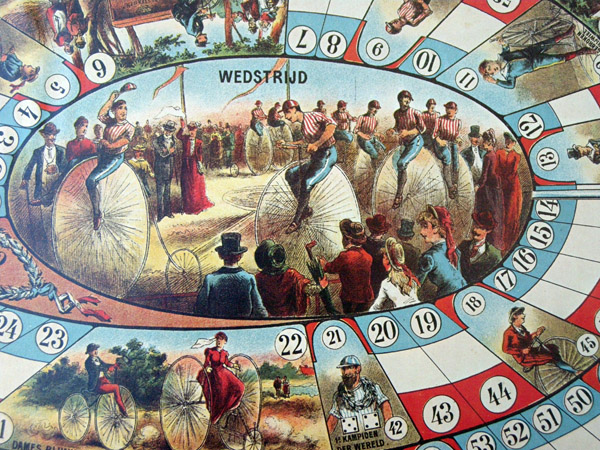 Rob added: There is some misconsensus about what is officially the first world championship for cycling. In Dutch there is a clear difference between 'wieler sport' and 'wielrennen'. The former is older and actually had its first 'world' championship in 1868, won by the English cyclist James Moore. This person did however not have a beard either, so I guess the picture on the game could be some free interpretation of the artist, or perhaps it refers to another so called "1st World Champion".