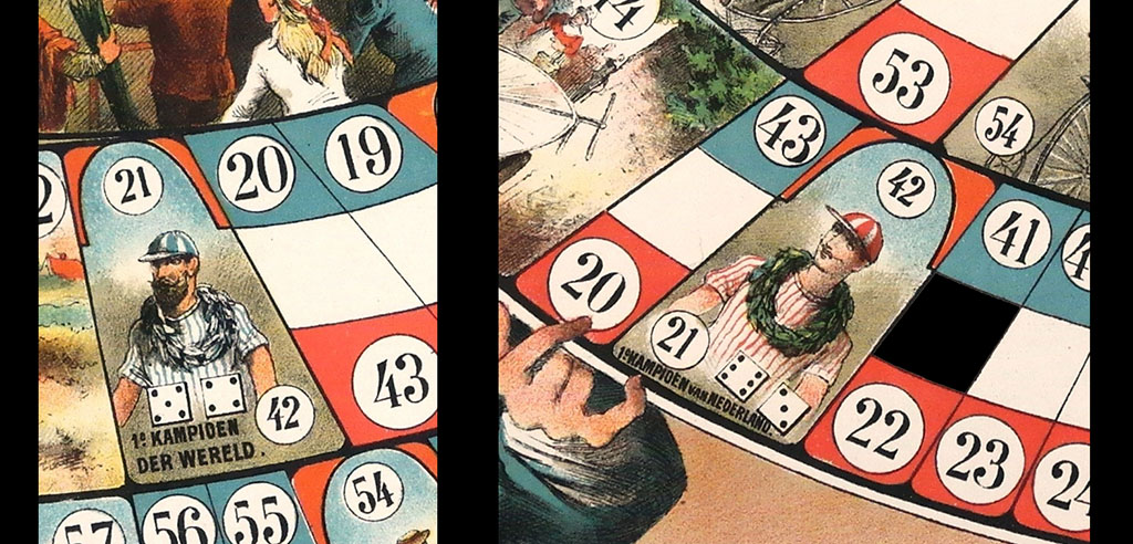 Notice the Dutch and World champion images (see below). The first Dutch National Championships were held in 1888, but the first official World Championships were not organised until 1893. (By the way, these were track-cycling events. The most-often cited date of 1927 is that of the first road race world championship for professionals won by Alfredo Binda. The amateur road race world championship was first held in 1921). Of course there were riders unofficially considered "world champions" since the first cycling races were held back in 1868, but since the date of the game has been established as 1891 by Rob van Linden of the HONGs Archive, the rider displayed on square 21 cannot have been the official world champion (see below for discussion).
