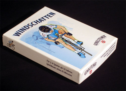 Promotional game for Gerolsteiner mineral water. The game consists of a deck of cards, some carboard counters and a special 6-sided die with only numbers 2,3 and 4 (repeated, of course). Most of the cards are road segments, some of them with a Gerolsteiner area where you can gather up Gerolsteiner energy counters. The rules of this one are quite simple (just another dice game), which disappointed me considering that "Windschatten" means "protection from the wind", and this made me expect a more tactical game. Anyway, the more games I have, the more I appreciate small ones!PS: Thanks, Geert, for sending me this one.