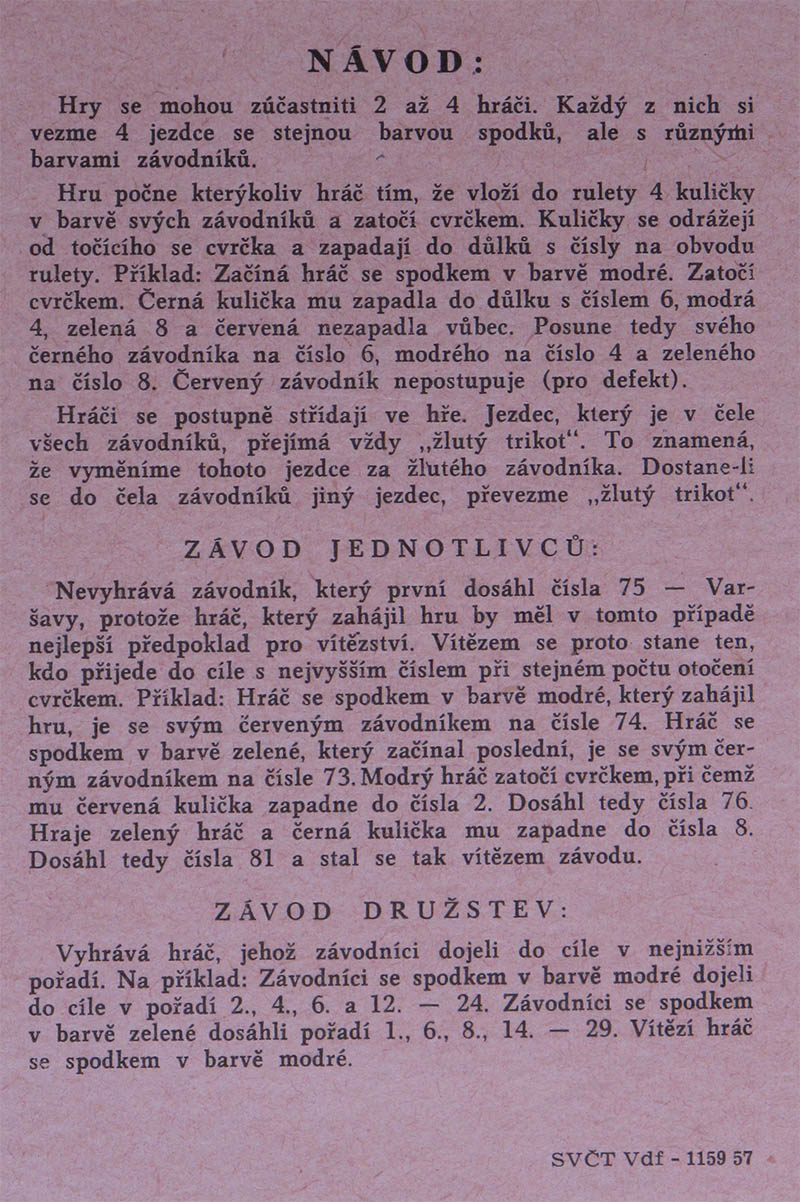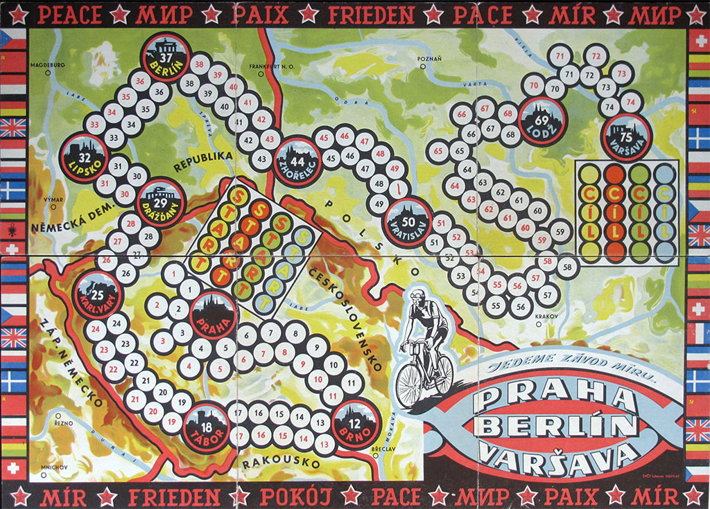 This is an unusual Czechoslovakian game that represents the Peace Race (in Czech: Závod míru, also known by its German name, "Friedensfahrt or by the French "Course de la Paix"). As you probably know this race was a stage race held in Czechoslovakia, East Germany and Poland. It was "the world's biggest amateur cycling race". The first edition was held in 1948 and the last in 2006, but by then the race (and the world) had changed a lot.