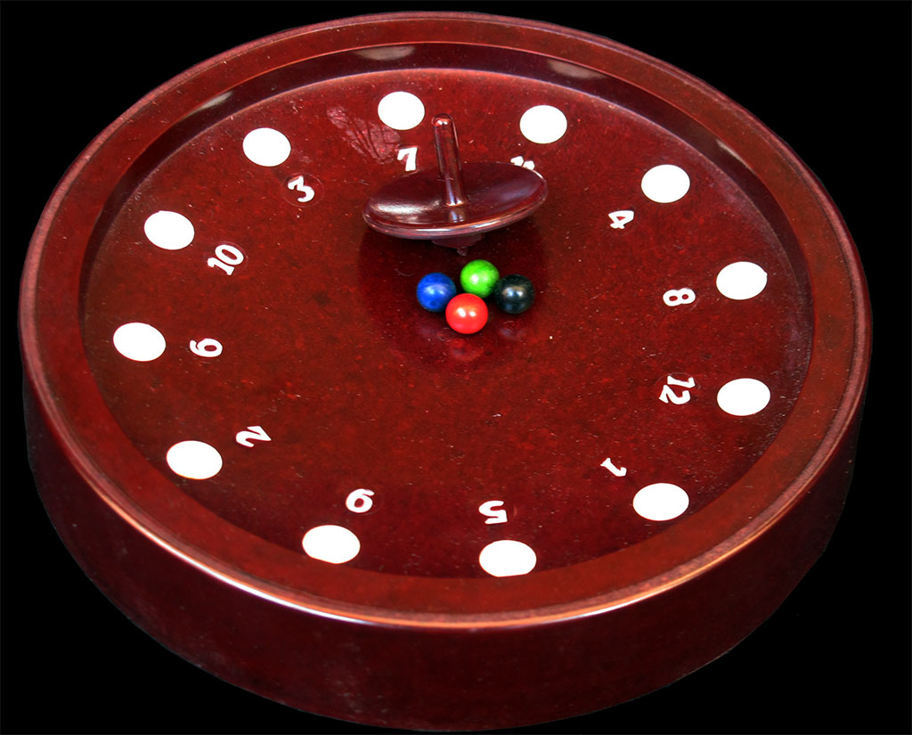 The most amazing feature of the game (and what makes it different) is that it does not have a dice but a spinning top that hits four small coloured marbles which fall randomly into holes numbered 1 to 12. Players need some dexterity to make sure that all the balls fall into a hole, but apart from that the result of the throw is random