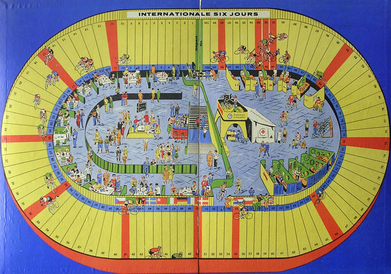 Both the 1959 german edition, by VEB (K) Kartonagen und Bürobedarf and the "belgian" edition feature the blue board (in the german edition it says "INTERNATIONALES BAHN-OMNIUM" instead of "INTERNATIONALE SIX JOURS").