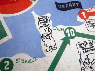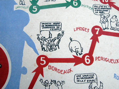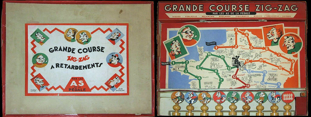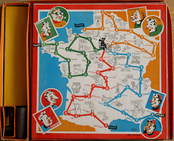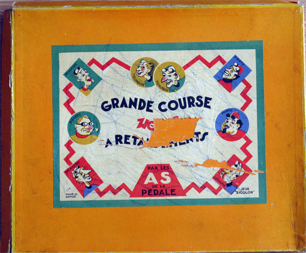 There are several versions of the game. Here is a smaller version from Pierre & Bilou's collection. What's strange is that on this (also smaller) board one of the riders (round red rider on the bottom left) does not have name.