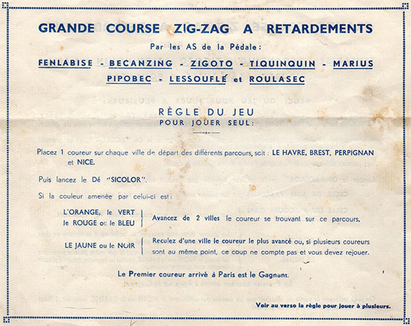 However, in the other rules (see above), the colour of the die throw has no relation whatsoever with the colour of the cyclists. I do not know which were the original rules and which the variation. What I can tell is that these newly found rules are obviously more elegant (with the other rules, one wonders what is the use of having a colour die in the first place). My guess is that these are the original rules, but further research is needed to be sure.