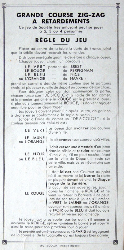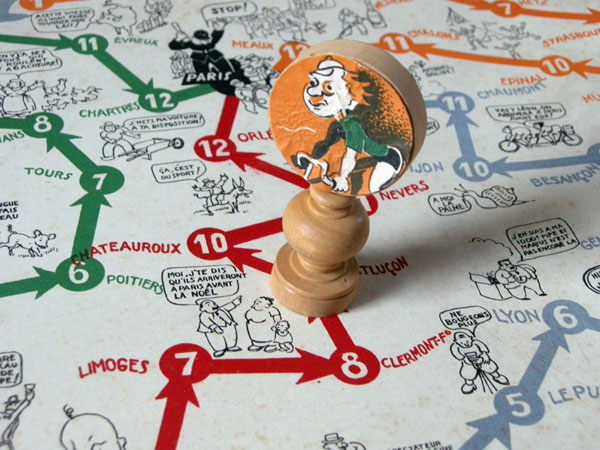 Players used coloured dice, with which they either advance one or two towns, get blocked, or pay a chip to the pot. The first player to reach Paris gets the contents of the pot.