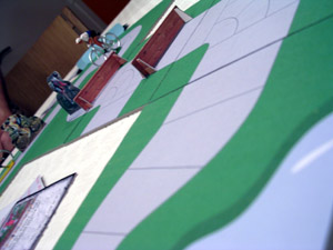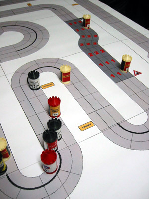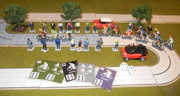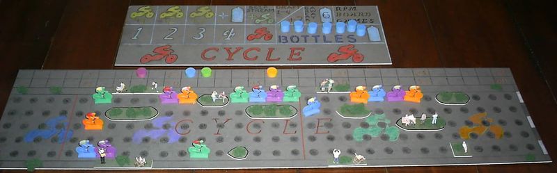 As you can see, the prototype had cardboard riders (well, if you see one made of plastic... it was a substitute since we were more players than cyclists), fences, even a ramp!