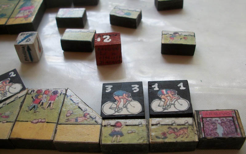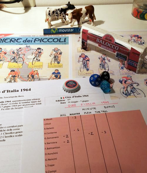 UPDATE 2022: Daniele Banfi keeps making cycling games. His creativity knows no limits. Here are a couple of examples (formally similar, maybe, but different in rules). One of them is inspired by yours truly's Keirin game, as you can see.