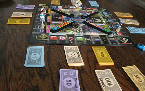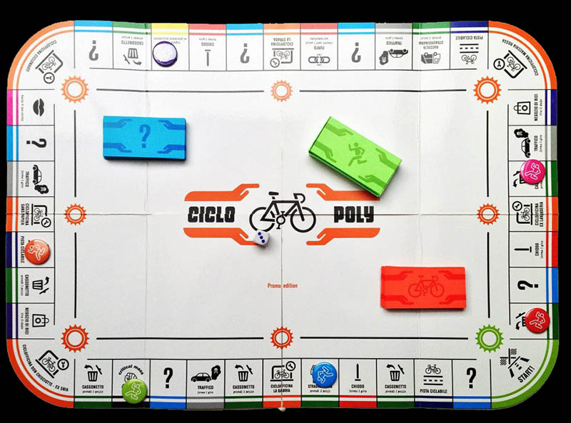 This is a board game designed by Paola Chiarolini upon an idea from Rossella Ottaviani for the Ciclofficine Popolari in Rome. The Ciclofficine, by the way, are bike co-ops where you can repair your own bike and, of course, are ideologically at the other end of the spectrum of what the Monopoly game means.