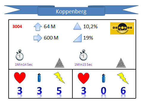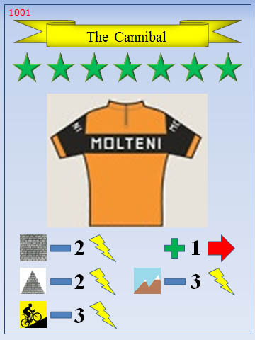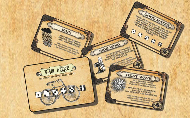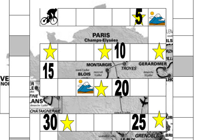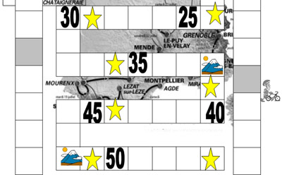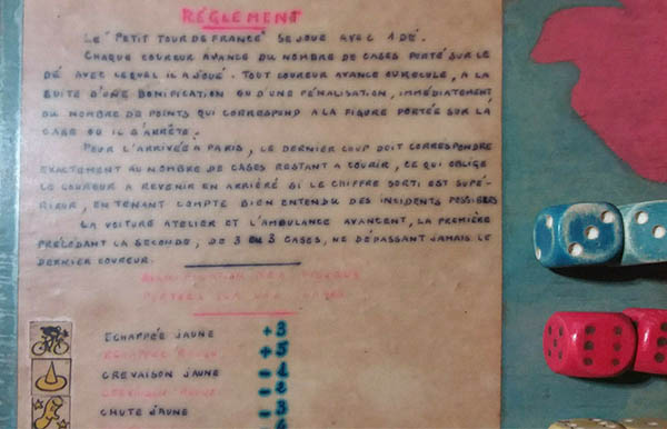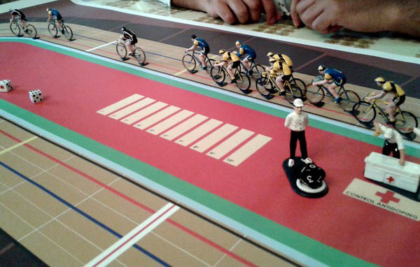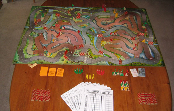 This is a game made by Dominique Paget from France. It is a dice game, complete with rules for almost every cycling topic (climbs, aspiration, energy management, time-keeping for stage races...) Most of the rules are what you might expect from this kind of game, including chance cards and different dice for different types of road ("oh no, another roll-and-move dice game!" I hear some say), but the energy management rule is original and gives the game a strategic touch.