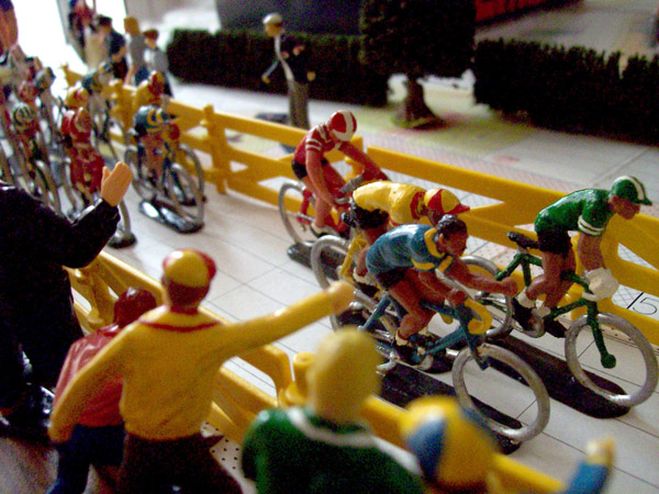 (a) Chaque jour au milieu de l’après midi, je revenais me poster devant la télé [..] Mes heros. Jamais fatigués, toujours prêts, en attendant la transmission, à courir une étape “pour de faux” avec mes petits coureurs de métal que j’alignais dans le couloir carrelé, propulsés par le jeu du hasard et à coups de double-six. (“Mes Tours de magie” in C’est mon Tour, collectif, Eden, 2003, p.36)