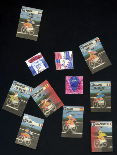 These bits and pieces were found inside a copy of Sprint. Of course, most them are cut from the press, but Induráin , Fondriest and Zberg are handmade. Again, if you recognise them, contact me.