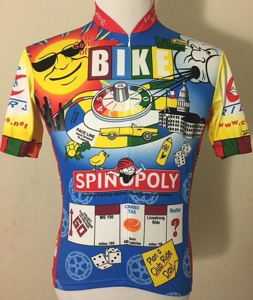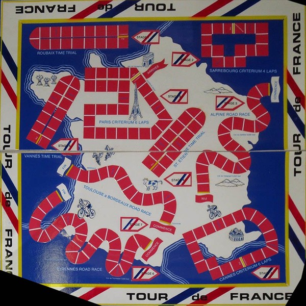 This is a game you can find on Google patent browser. It is a stage race game played by 2 to 8 people with one die. The abstract states: "A board game used for playing a bicycle or tour race with an improved game board. The game board includes indicia thereon which defines a plurality of parallel tracks which extend along an interior periphery of the game board, the tracks extending around the entire game board. At least a section of the parallel tracks pass through indicia on the game board defining a geographic area which includes indicia defining sites and places of interest within the geographic area defined. Overlay strips, defining other geographic areas with sites and places of interest within the other geographic area are provided, for changing the geographic area on the game board. The board includes a set of receiving and retaining slots for receiving and retaining overlay strips for changing the geographic area through which the tracks of the race pass".