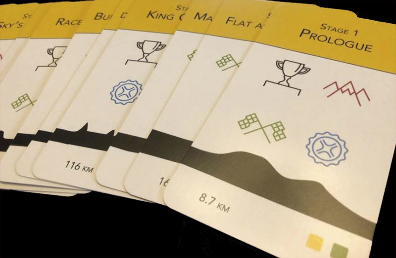Stages is another game which after an unsuccessful Kickstarter campaign I am not sure if it will be (or even if it has been) released. It is (or was) a 2-4 player card game simulating a 21 Stage Grand Tour Bicycle Race, where players assemble teams and battle for stage Wins. Each stage has a different profile and players are team directors who choose between different types of riders ("Captain", "Sprinter", "Climber", "Domestique" and "Super-Domestique") for each stage. There are 130 different stages to make endless Tours.