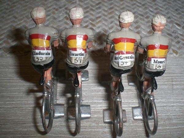 These cut-up riders, and many more (over one hundred) were purchased in Zaragoza, Spain. Each cyclist has a name written on the back and they make a peloton of ca. 1980. Someone did A LOT of work with this set.