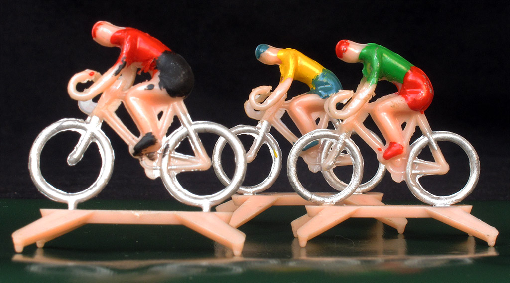 These cyclists are made of stiff plastic (probably polystyrene) and they are very stable on their four-legged wide bases.