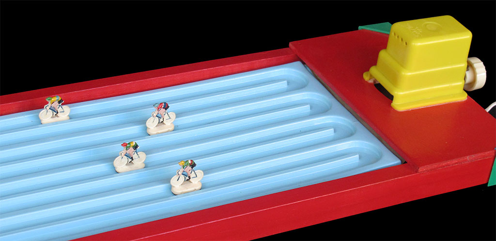 The game consists of 4 oval tracks which vibrate. The cyclists (or cars, or horses) are unevenly weighted so that they always advance, no matter in what part of the vibrating track you place them. I'm sure, the "secret" that drives the cyclists/cars/horses forward is the "fur" at the underside of their base. The vibrating track moves equally towards all possible directions. This movement causes corresponding forces onto the cyclists/cars/horses. As their friction coefficient is lower when moving forwards and higher when moving backwards (because of the fur) and as they cannot move sideways, the sum of all applied, variing forces always will move the cyclists/cars/ horses more forwards than backwards.
