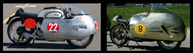 The third motorcycle (number 37) is a Norton Manx 500 (one cylinder, DOHC), one of the most popular and successful racing machines ever, built from 1950 to 1962. In the starting list of the 1956 German Grand Prix 19 of 37 machines in the 500 cc class were Nortons. Even 6 of the 12 German riders preferred Norton. In the 1950s Norton motorcycles were present in almost every race. I can understand why Norton was so popular – just look at this straight-designed, well-proportioned beauty! And she also was both quite fast and reliable.The second machine is another Norton (compare the characteristic frame tubes and the exhaust pipe), it's only equipped with an aero cover. I found no picture of exactly the same cover, but the left picture below (a 350 cc Norton) isn't far away. The right picture below would come closer. It is a DKW RM 350 (nick-named "the singing saw" because of its sound, the 3 cyclinder two-stroke engine ran at up to incredible 15.000 revs). In the mid 1950s many different aero covers were used, aero testing was done by "trial and error" in the races. When some years later the aero design options were limited because race accidents had increased, most aero covers became scrap metal, so only few original parts survived.