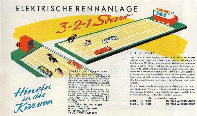 About what is the title and what is the subtitle of the games: Because of the three versions, at least for the German game it's the other way round: "Elektrische Rennanlage" is the (trivial) title of the game and "3-2-1-Start" only is the subtitle (of the 2nd game), to differentiate it from its sister-product "Hinein in die Kurven" (1st). The 3rd game according to the catalog has a different title, it's a "Elektrisches Auto-Rennspiel" ("electric car racing game") and its subtitle is "Start zum Großen Preis". Of course that's only logical for the German games. As Sel-Mac only has one version, you're free to choose what's the title and what's the subtitle. [I am not sure I agree on that: I still think that the name of the game is "3-2-1 Start"]