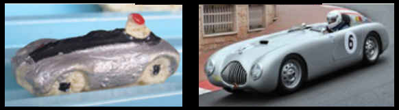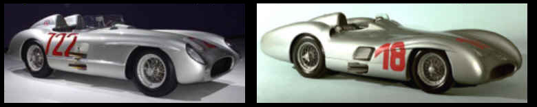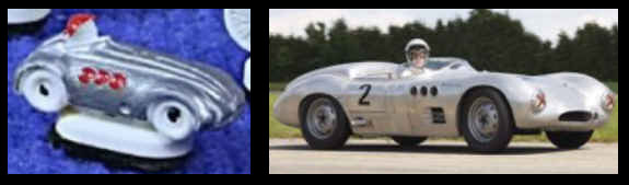 The most obvious choice of course would have been a Mercedes-Benz, as Stuttgart-Untertürkheim is less than 30 km away from the Fibro site. The famous 300 SLR (left) has different air outlets, but a long motor bonnet and a swing in the side line, but it came late, in May 1955. The Formula one W196 "streamline" of 1954 (right) for my taste would match the Fibro car better – moreover it's a single seater and this model was popular as a toy in the 1950s, Schuco sold many of those.