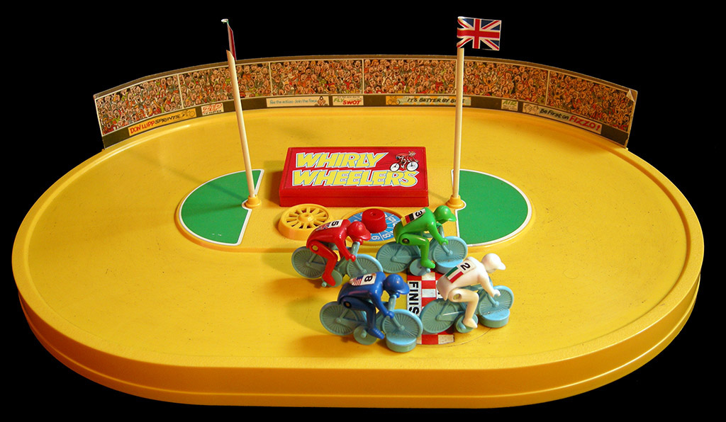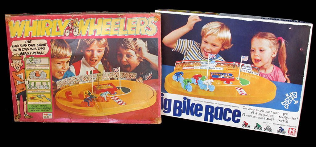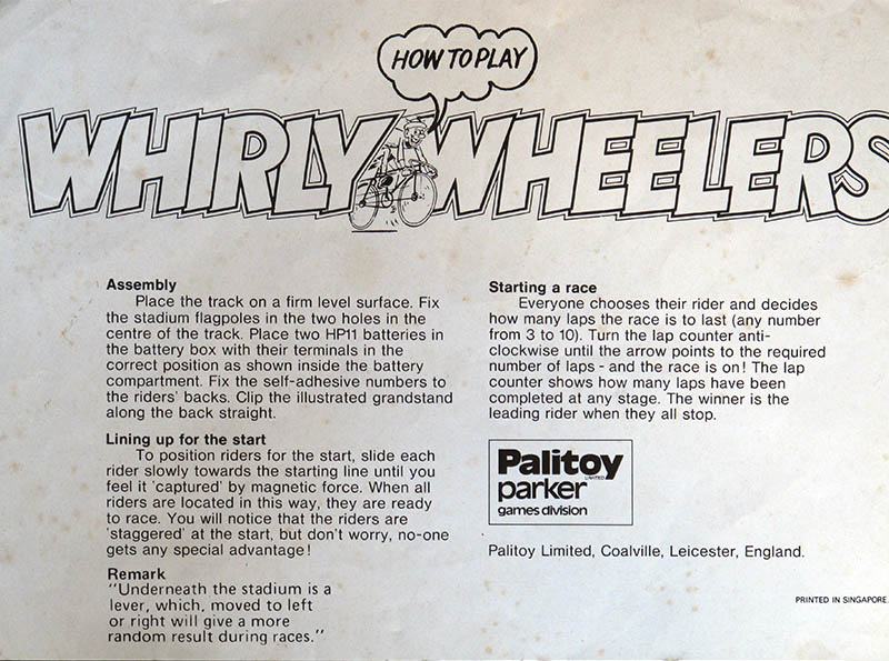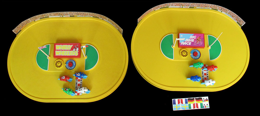 As you can see there are two versions of this game with the oval track. Both of them were manufactured in Singapore. The Whirly Wheelers version was licensed by Politoy Parker in the UK, while in other countries the game was sold as Big Bike Race.