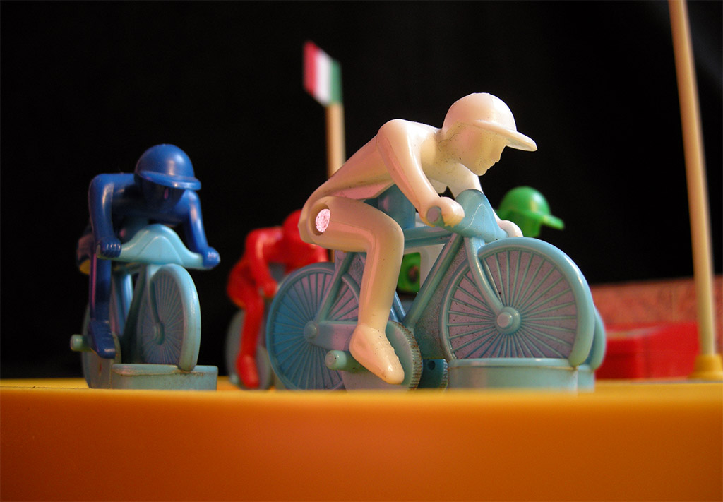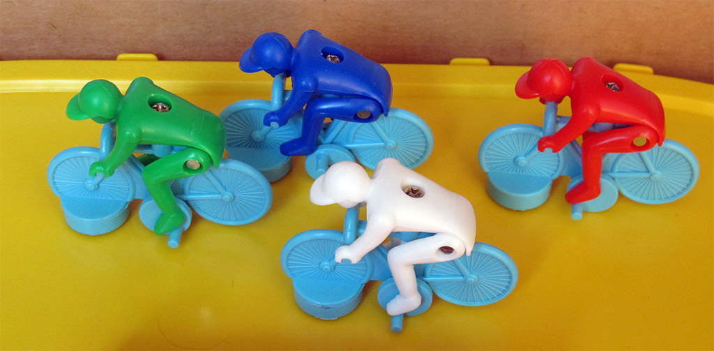 One of my favourite toys. I can spend hours watching the riders race. (I should have made a video, but you can check YouTube for some footage of this game). Cyclists are pulled by hidden motorized magnets, and the outcome of the race is supposed to be aleatory. There are two major versions of this game, this one with an oval track and another with a round track. I prefer the version with the oval track. Laps are somewhat longer there is a lever underneath the board supposed to change the level of randomness.